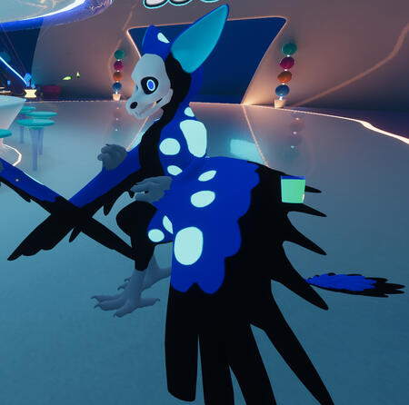 This public VRChat avatar (made by Alex and based on Kathios's model) has an exposed skull on its face (unusual), light blue skin on its ears (uncommon), and glowing markings (unusual), but is not part of the species canon and so does not need any explanation. It just looks cool!